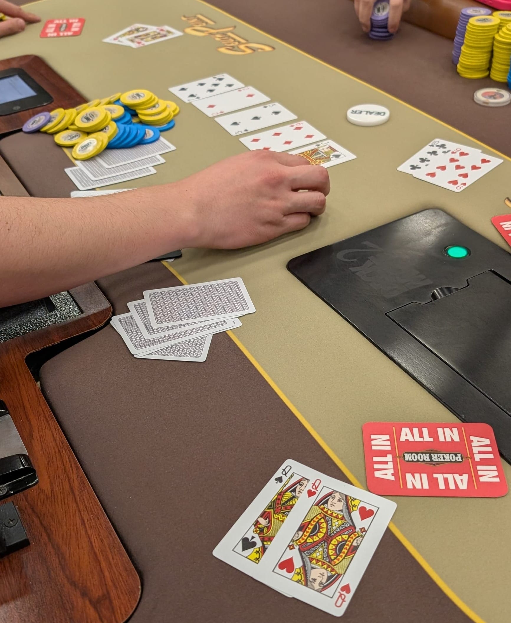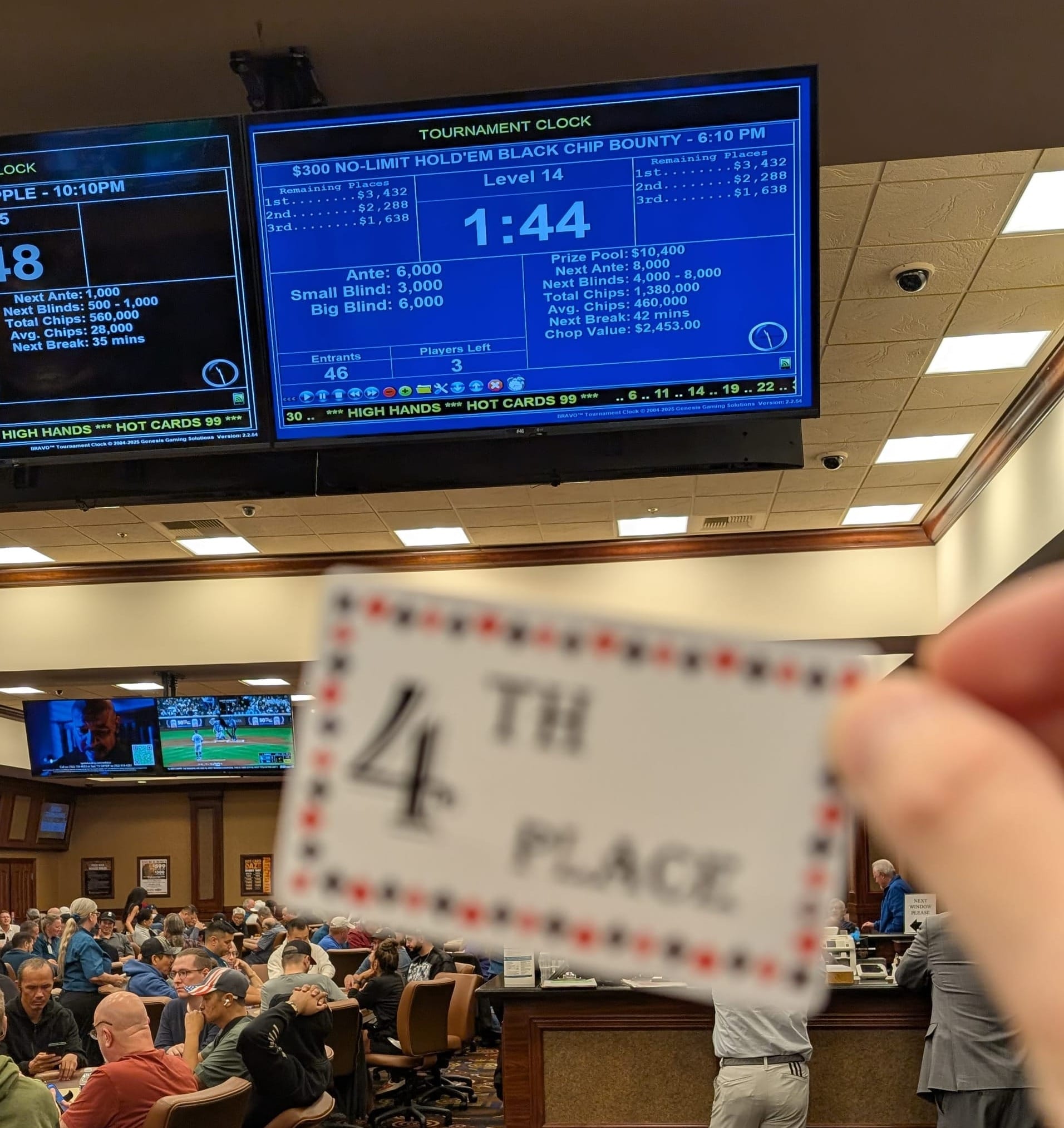 I went to SouthPoint for the 6pm black-chip bounty tournament yesterday. I was overall happy with my performance and the result, but I think something I'm still a little frustrated is having to constantly be short-stacked for the entirety of the tournament. I hit 100k very briefly before succumbing to the big stacks applying pressure. My current excuse is being card dead, but there was one hand where I might have been better off shoving.
